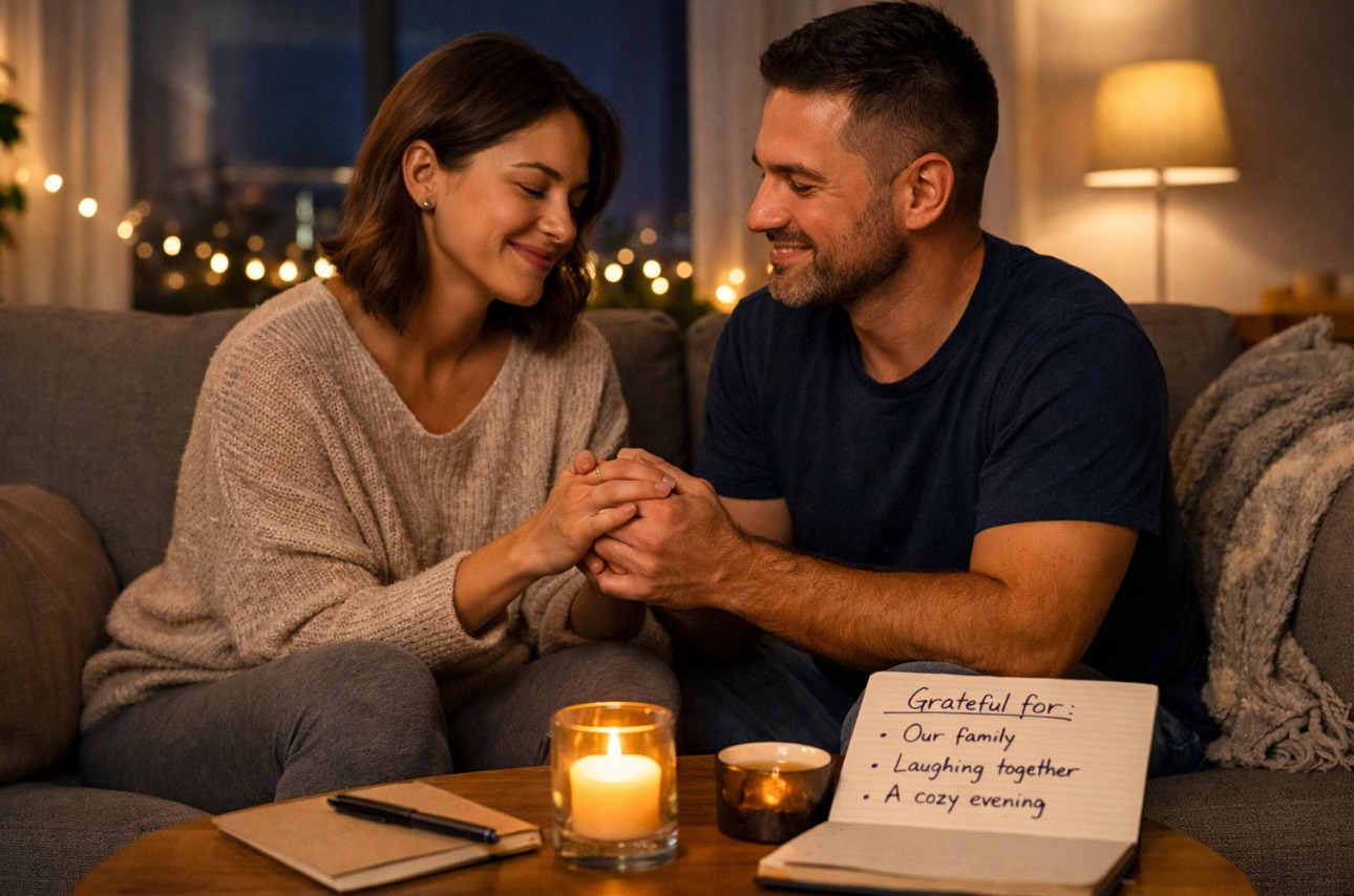 Evening gratitude helps couples land. Share one thing you appreciated about your partner and one thing you appreciated about the relationship that day. Some couples find this cheesy at first, then realize it changes what they look for during the day.