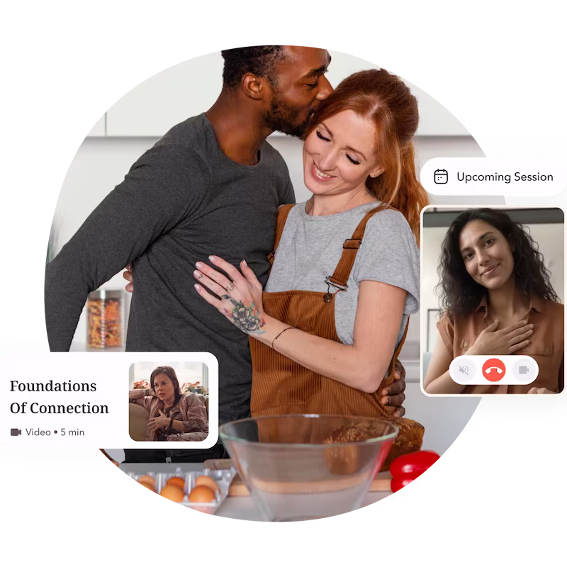 You'll meet weekly with a trained relationship expert who gets to know your unique situation. Between sessions, you'll receive personalized videos and exercises in-app, designed to support your goals and keep your relationship growing. Everything is flexible, practical, and built to fit into real life.